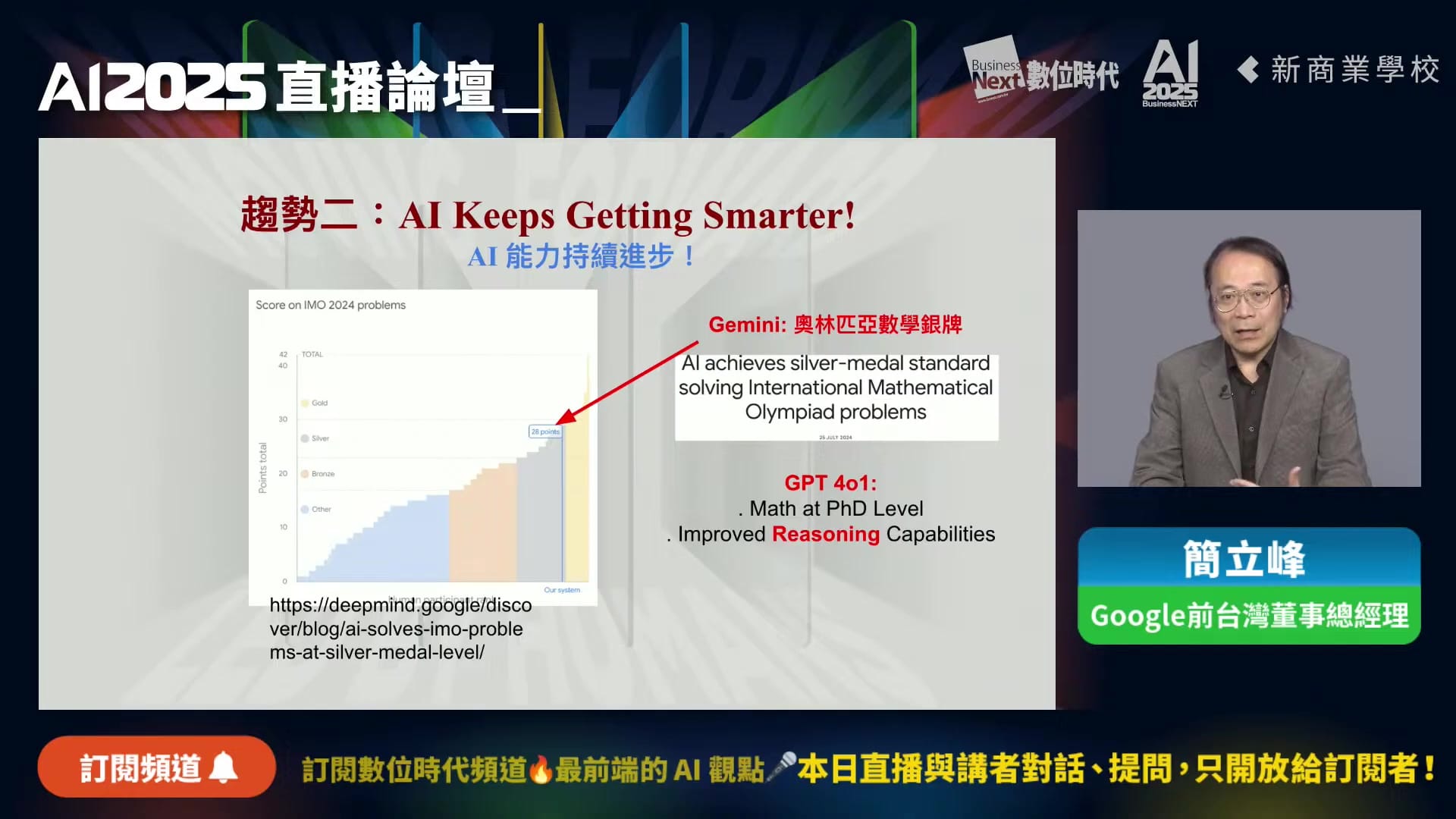 第二個趨勢是AI能力的持續進步。「在2024年5月這個時間點,我們都會說AI很會講話,不過數學能力很差。」簡立峰表示,但情況已經有了巨大變化。2024年年底,Google的Gemini已能在奧林匹亞數學競賽中獲得銀牌,而GPT也宣稱達到了數學博士的水平。