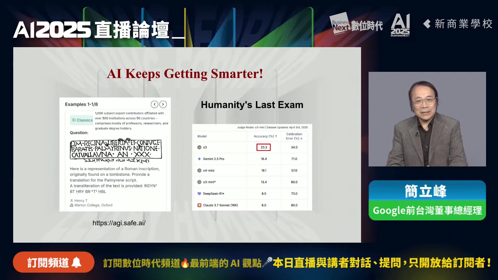 這種快速進步還體現在所謂的「人類最後考試」上。科學家們設計了2,500道極其困難的問題,這些問題只有極少數人能解答。「為什麼叫最後的考試?就是他們預估...這些題目如果都解掉之後,人類也沒有人可以再出難題考AI了。」雖然這可能有些誇張,但AI已經可以解決約20%的此類問題,這顯示了其自主學習和解決複雜問題的能力正在迅速提升。