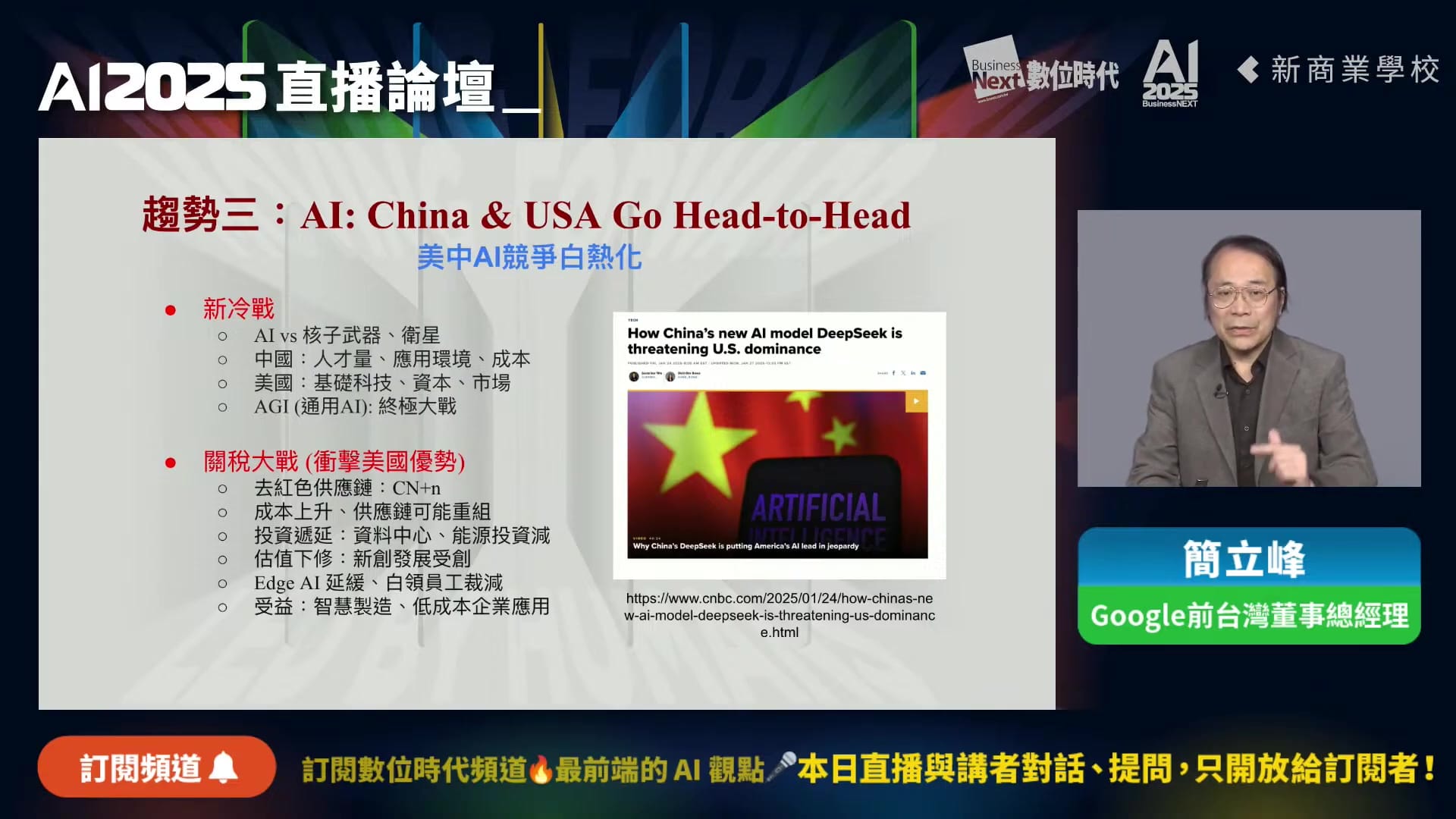 第三個重大趨勢是美中在AI領域的競爭。「這有一點像到幾十年前美蘇的競爭,」簡立峰指出,「當年競爭的是核武器,那現在看起來競爭是一個AI的通用AI。」這種競爭已經延伸到關稅戰和匯率戰,而臺灣因其在半導體製造的關鍵地位而頻頻被提及。