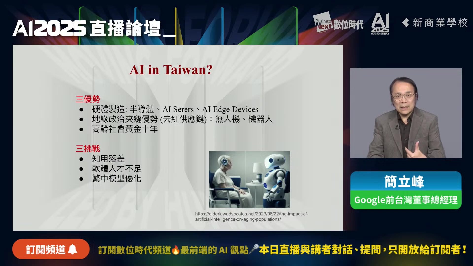 臺灣除了在半導體和硬體製造上具有優勢外,還面臨高齡化社會的挑戰。根據OECD的調查,當一個國家65歲以上人口達到四分之一時,就進入了超高齡社會。簡立峰指出,「在超高齡社會的之後的十年,常常是那個國家的黃金期。那臺灣從今年開始已經進入這個黃金期。」