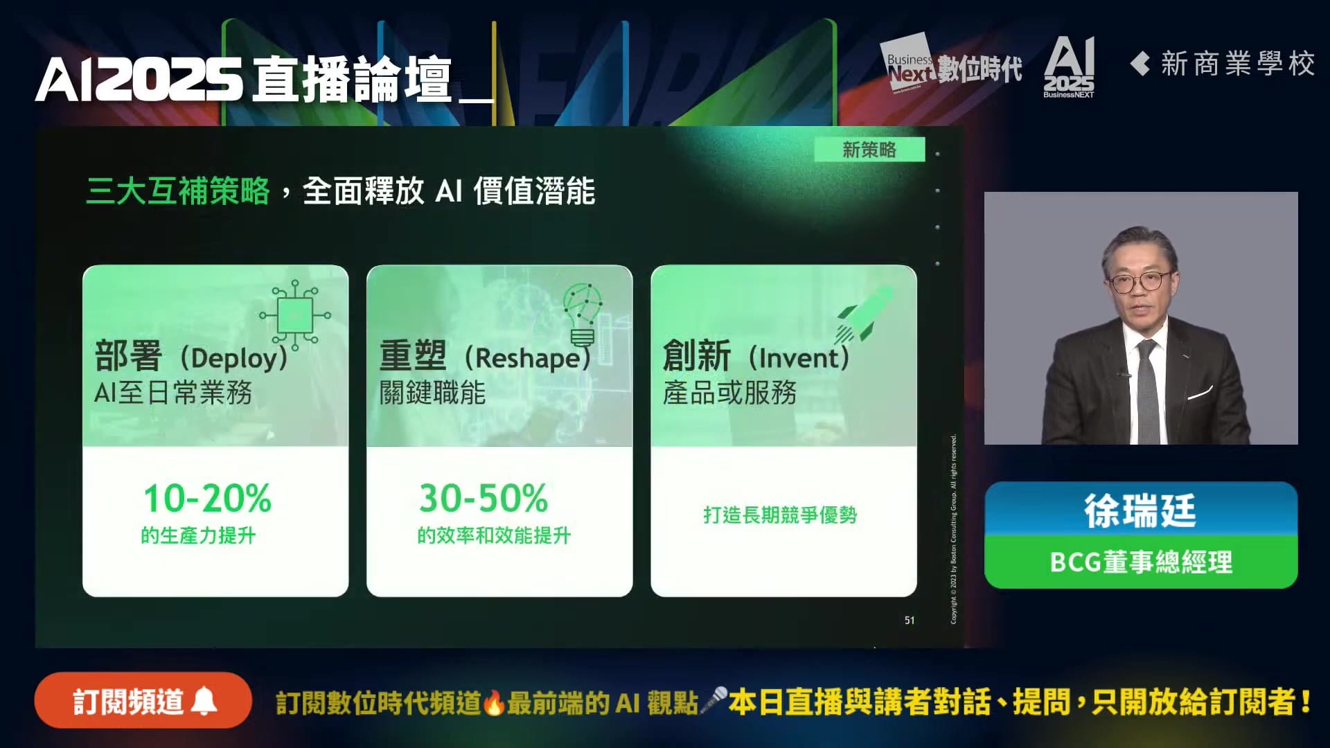 BCG觀察到AI有三種主要用法,徐瑞廷以英文詞彙Deploy(部署)、Reshape(重塑)與Invent(創新)來說明: