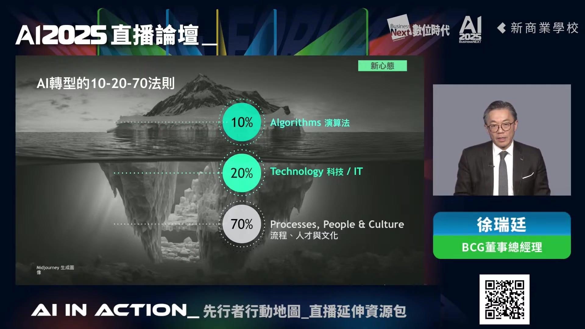 「推動AI轉型最大的障礙不在演算法或科技,而在管理層面。」徐瑞廷以冰山比喻,表面上的10%是演算法,20%是IT技術,水下70%則是流程、人才、文化等管理問題。