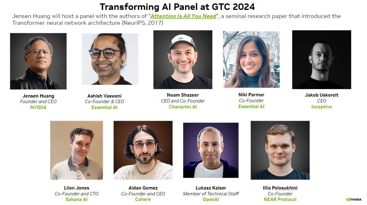 在GTC 2024的座談中有七位作者出席,缺席的是Niki Parmar,因家庭緊急情況未能參加。黃仁勳表示「我們的心與祝福與她同在」。